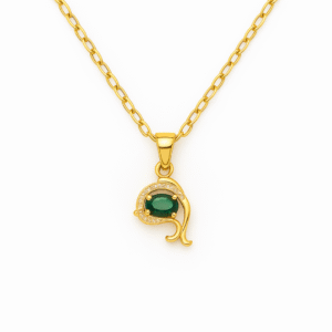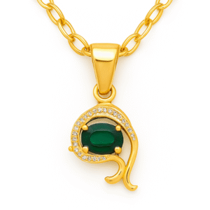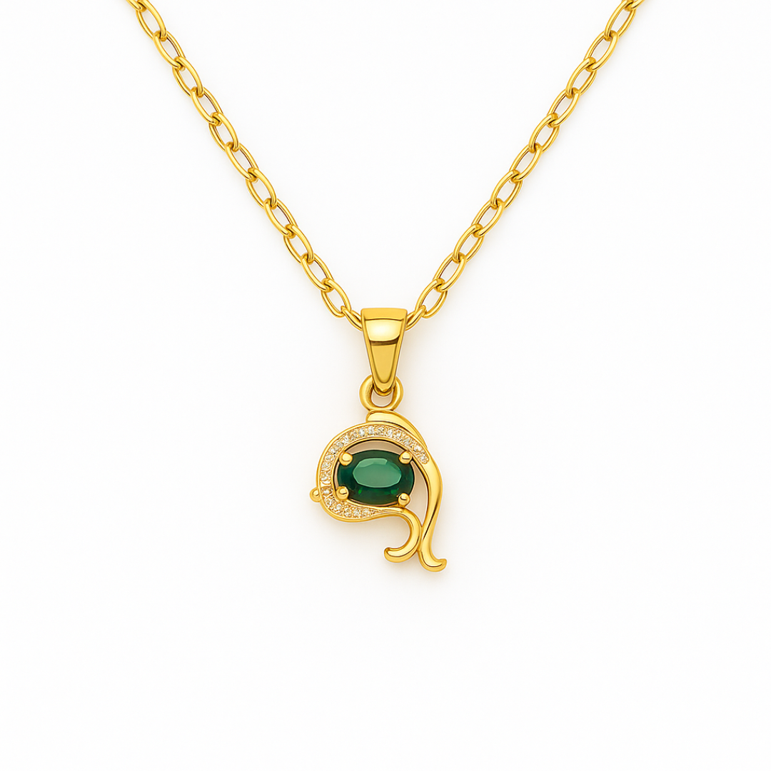This Emerald Swirl Pendant Necklace is a perfect blend of elegance and creativity. At its centre lies a rich emerald green oval stone, carefully set within a graceful swirl design that symbolizes flow and harmony. The surrounding crystal accents add a radiant sparkle, giving the pendant a refined, luxurious finish. The sleek golden chain enhances its charm, making it suitable for both festive occasions and sophisticated daily wear.
